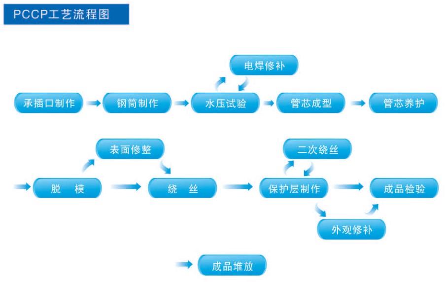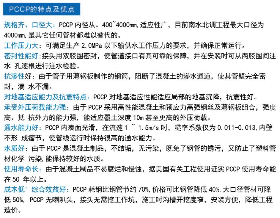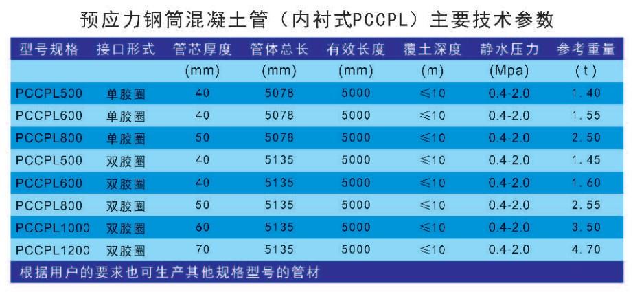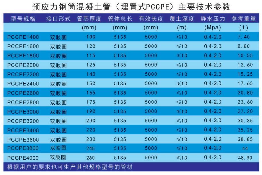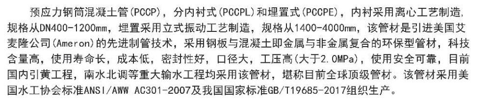 預應力鋼筒混凝土管(Prestressed Concrete Cylinder Pipe)簡稱PCCP,分內襯式(PCCPL)、 埋置式(PCCPE), PCCPL是由鋼筒和混凝土內襯組成管芯,在鋼筒外側纏繞環向預應力高強鋼絲,然后輾射水泥砂漿保護層的管子。PCCPE是由鋼筒和鋼筒內、外兩側混凝土層組成管芯并在管芯混凝土外側纏繞環向預應力鋼絲,然后制作水泥砂漿保護層而制成的管子。PCCP是一種鋼板與混凝土 復合環保型管材。該管可用城市給水排水干管、工業輸水管線、農田灌溉、工廠管網、電廠補給水管及 冷卻水循環系統、倒虹吸管、壓力隧道管線及深覆土管道。